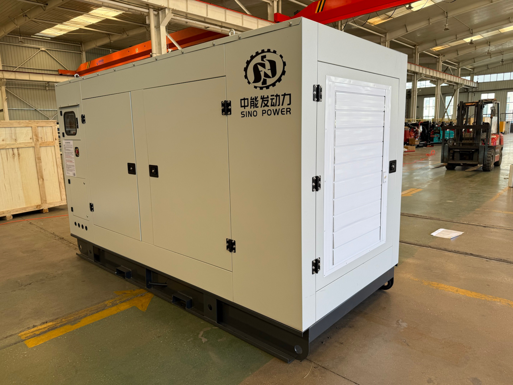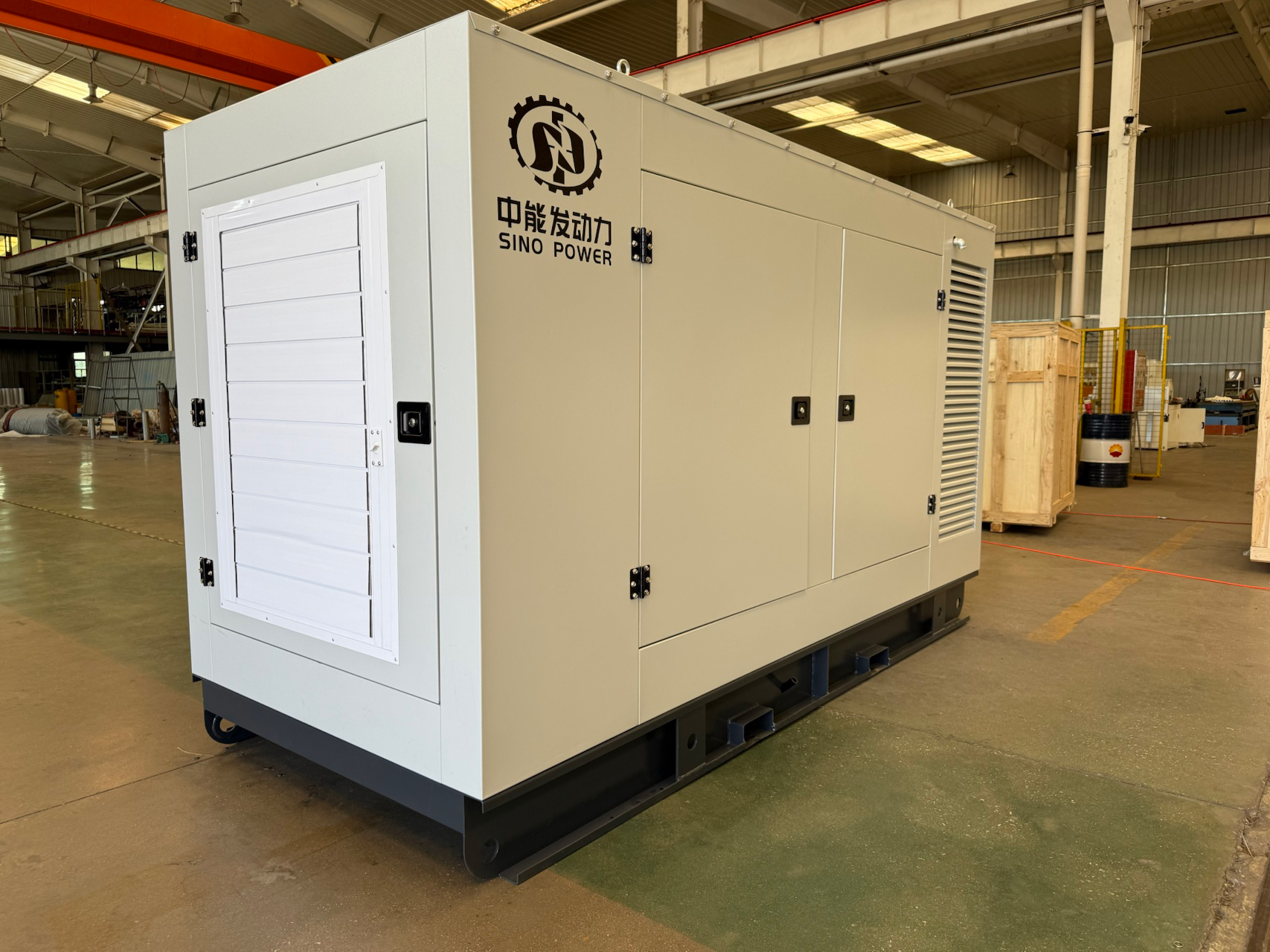 Inside the enclosure, the generator set features a well-organized layout that allows easy access to the engine, alternator, and auxiliary systems once the doors are opened. Multiple access doors are designed for convenient inspection, maintenance, and servicing, helping to reduce downtime and simplify routine operations.